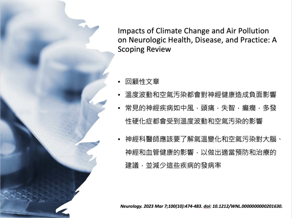 氣候變遷和空氣污染不僅影響了生活環境,還改變了神經系統疾病的發生率和臨床表現。神經科醫師需要了解這些環境上的變化對大腦、神經和血管健康的影響。