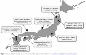 - 在日本8個地區收案 (如下圖,參考資料Study design and baseline characteristics of a population-based prospective cohort study of dementia in Japan: the Japan Prospective Studies Collaboration for Aging and Dementia (JPSC-AD) (biomedcentral.com)